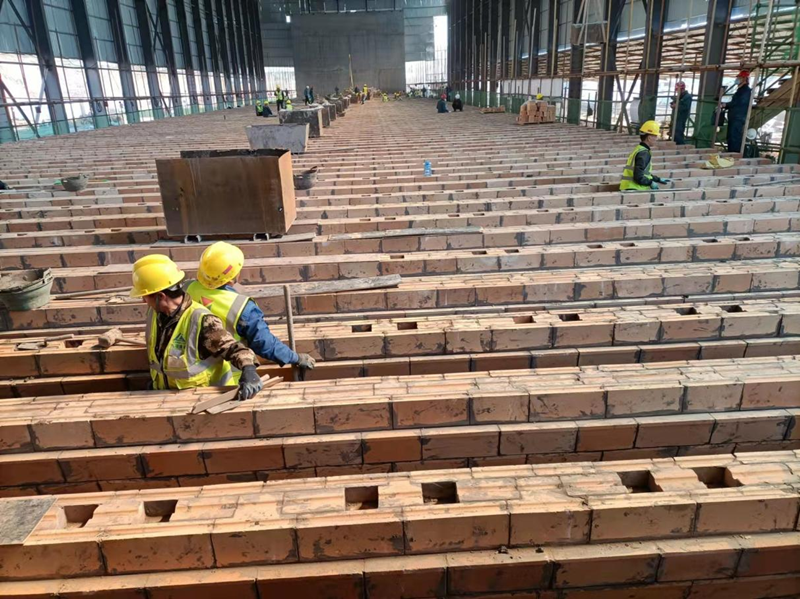 云煤能源焦化升級項目建設的7.6m頂裝焦爐,2座焦爐用磚量7萬噸,磚型多達1000多種,磚型復雜,對耐材生產供貨及管理要求很高,公司領導在耐材訂貨時就高瞻遠矚十分重視、派遣數位人員駐廠監制,云煤焦爐砌筑工期十分緊張,加上現階段國內新建焦爐較多耐材供應本就較緊張,以及受疫情以及冬奧會影響,生產供應更加困難。云煤1#焦爐砌筑時間與山冶負責設計與項目管理的山西盛隆泰達項目砌筑時間相近,且粘土磚生產廠家均包含濟源耐火爐業,粘土磚供應保障壓力極大。為了保證砌筑進度,云煤項目部積極協調各方、千方百計保證耐材供貨以滿足砌筑需求。一方面派遣專業工程師駐廠催交監制,另一方面協調其他耐材生產廠家協助粘土磚生產保供應。項目管理分公司負責耐材管理的石景林,每天不辭辛苦聯系廠家發貨、溝通到貨時間、協調施工方卸貨,晚上還要統計每天10~20車數百個磚號的到貨量。在耐材砌筑質量管理方面,我們外聘了2位有豐富施工與砌筑經驗的老同志,為焦爐砌筑施工質量保駕護航。
